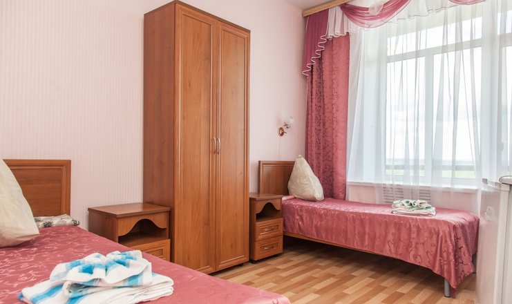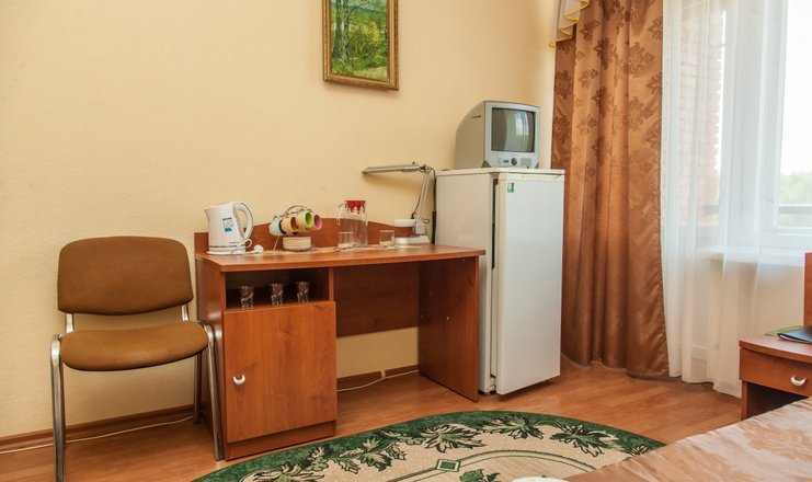 В номере: кровати односпальные или одна двуспальная, прикроватные тумбочки, столик туалетный, стул, шкаф, телевизор, холодильник, чайный набор посуды, электрочайник