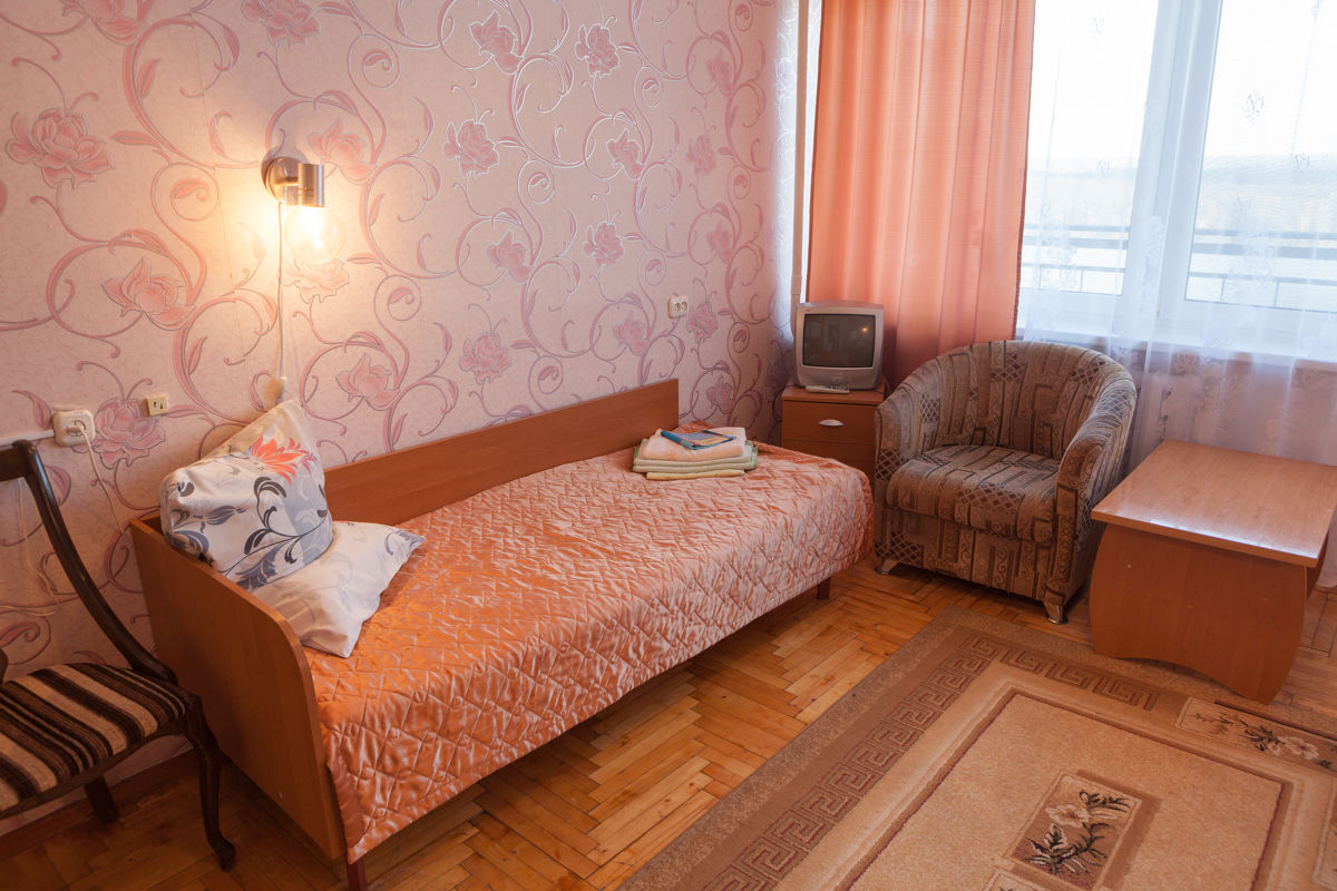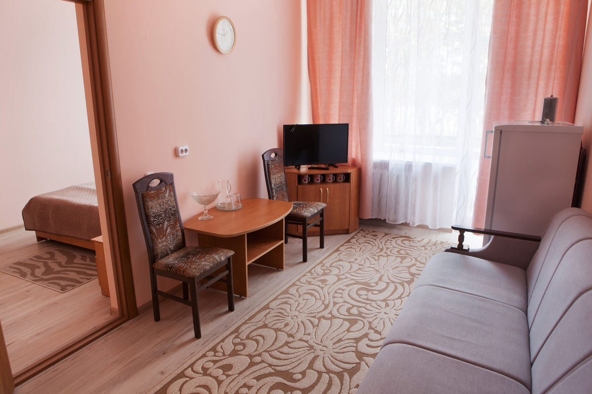 три односпальные кровати, две лоджии, раздельный санузел, телевизор, холодильник, чайник, два кресла, журнальный столик, утюг, гладильная доска, типовая площадь - 25 кв.м., возможно доп. место - еврораскладушка, 1 этаж корпуса №1