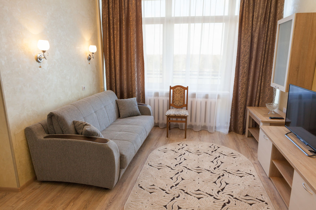 две односпальные кровати / одна двуспальная, две лоджии, раздельный санузел, телевизор, холодильник, утюг, гладильная доска, два кресла, журнальный столик, чайник, типовая площадь - 25 кв.м., большой раскладывающийся диван, 3 этаж корпуса №1