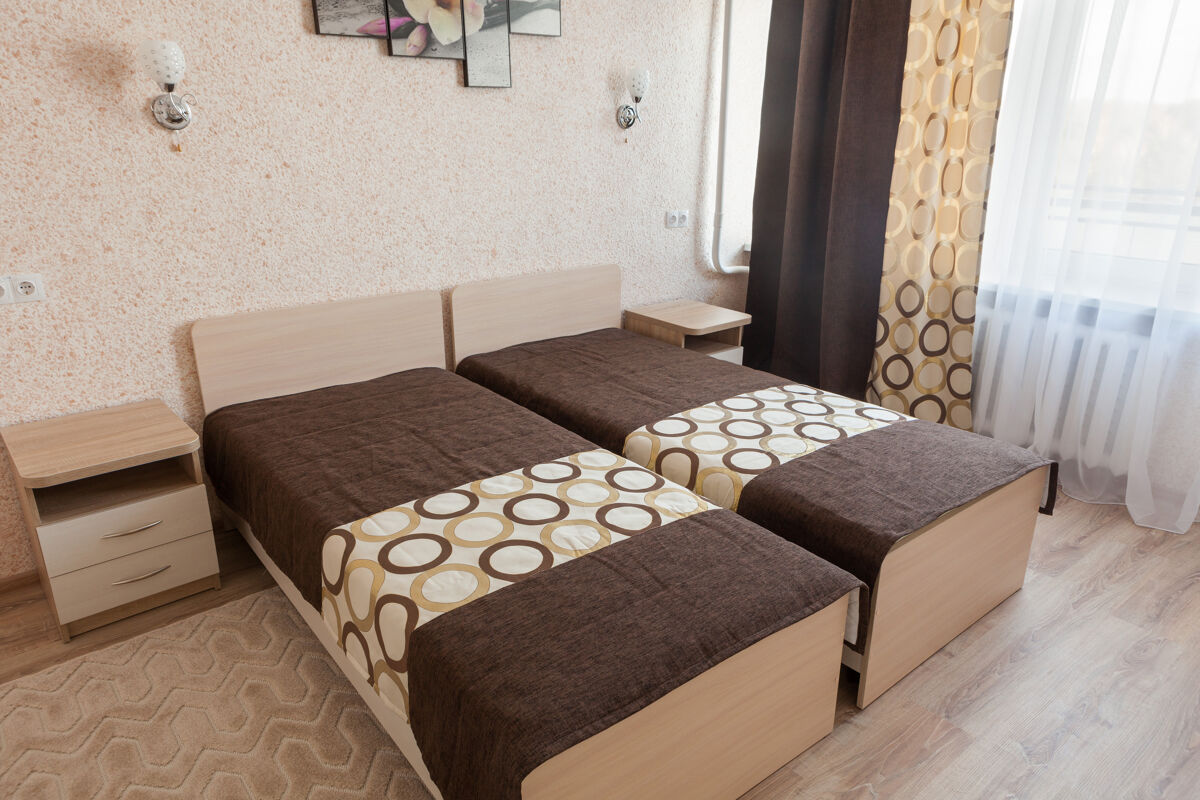 две односпальные кровати / одна двуспальная, лоджия, совмещённый санузел, телевизор, холодильник, чайник, два кресла, журнальный столик, фен, типовая площадь - 13 кв.м., возможно доп. место - еврораскладушка, 2-3 этажи корпуса №1 и 8 этаж корпуса №2