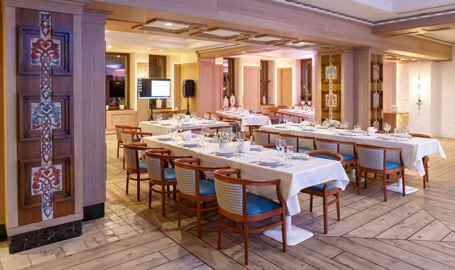 Современный буфет-ресторан с русской душой, передающий атмосферу светлицы. Отделка напоминает стены Суздальского кремля. Зал, подходит для проведения праздничных мероприятий, банкетов и фуршетов в любом формате: от системы «шведская линия» до фешенебельного банкета.