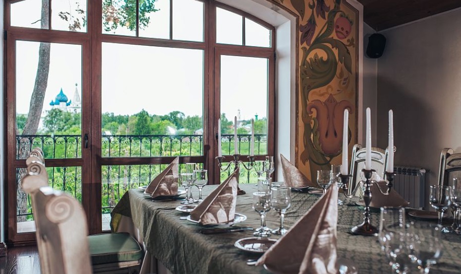 Зал выполнен в духе лучших аристократических домов России. Темное дерево, многоцветная роспись стен, узорчатое стекло и большое панорамное окно с видом на старый город. Стилизация в духе тронного зала царских палат вкупе с лучшим в Суздале видом на Кремль делает это место идеальным для проведения мероприятий.