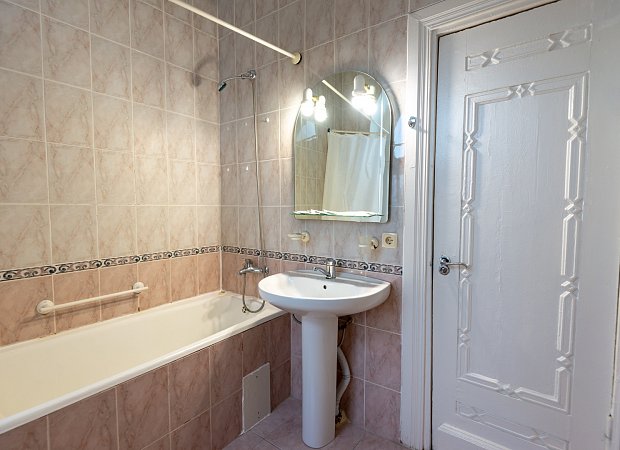 Санузел: ванна, унитаз, раковина, полотенца, гигиенические средства