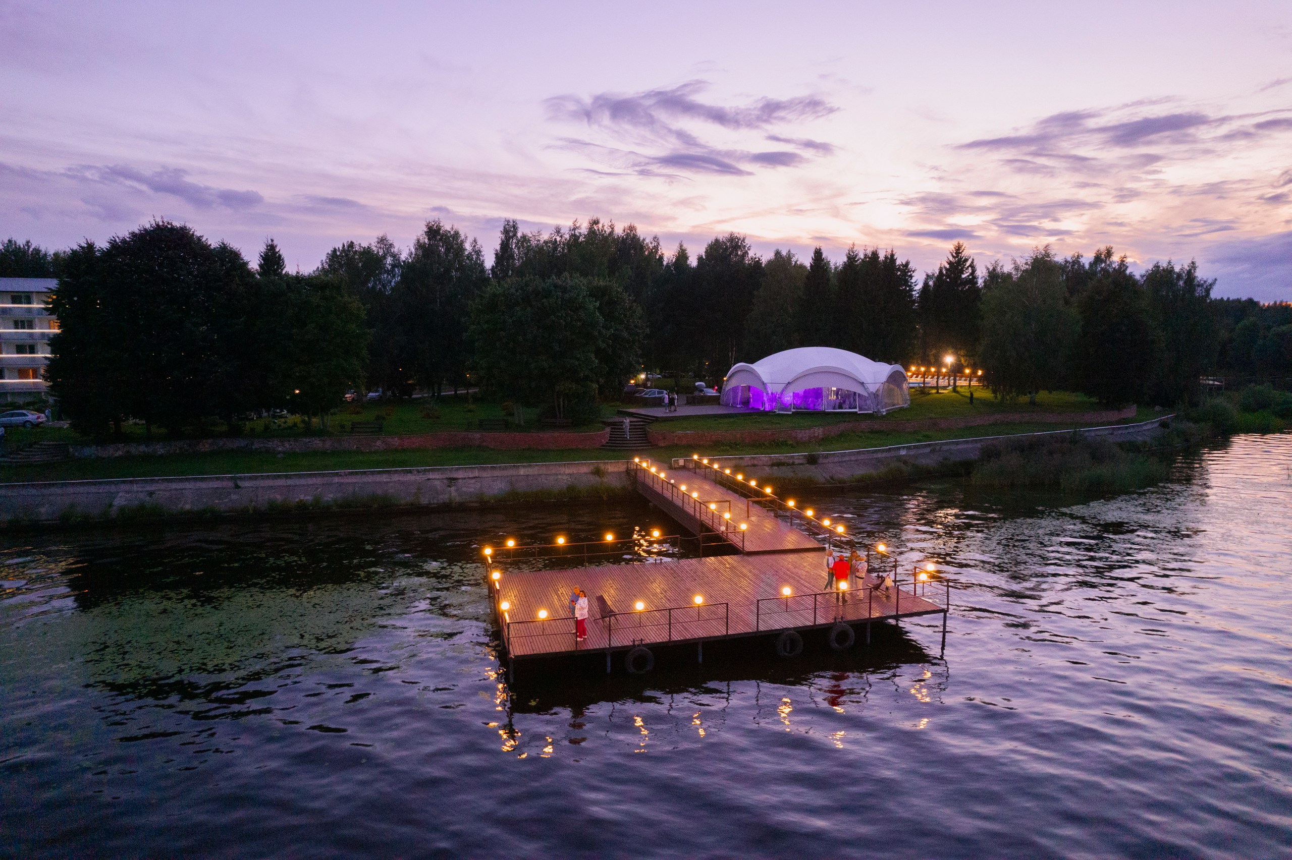 Белоснежный шатер стабилизировался в уединенной зеленой зоне с видом на Волгу.