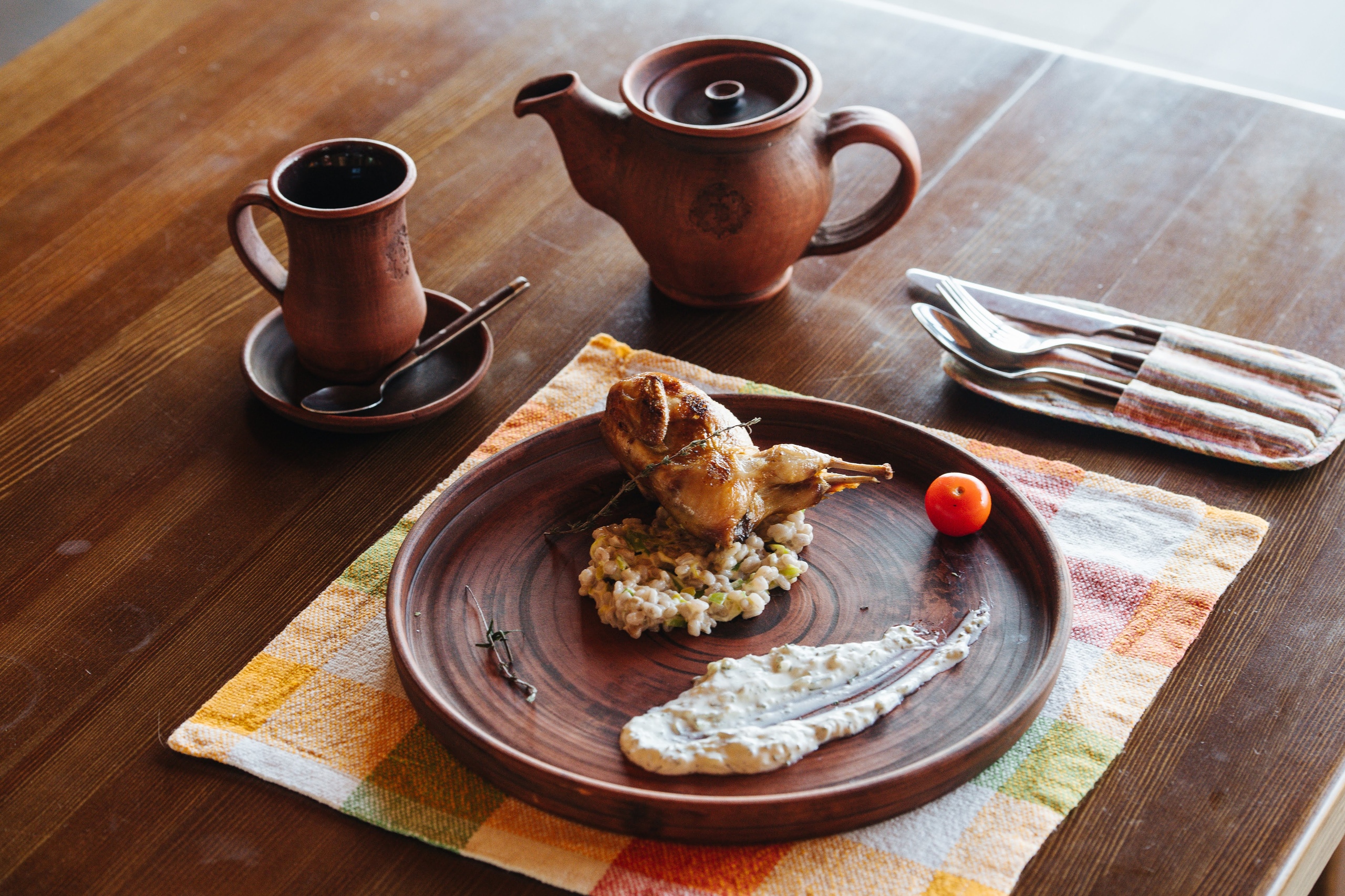 Интерьер ресторана сочетает в себе мебель из массива дерева, украшенные деревянные балками, глиняную посуду и текстиль, создавая благоприятное впечатление о месте. Каждая деталь помещения способствует общему уюту и выгодно смотрится в просторном зале под деревянным куполом.
